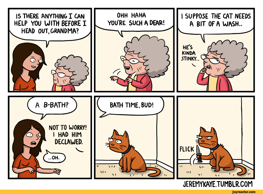 I don’t think this comic is suggesting anyone declaw or dump their cat in the tub. I’m pretty sure it’s just a setup to have a cat draw a knife.