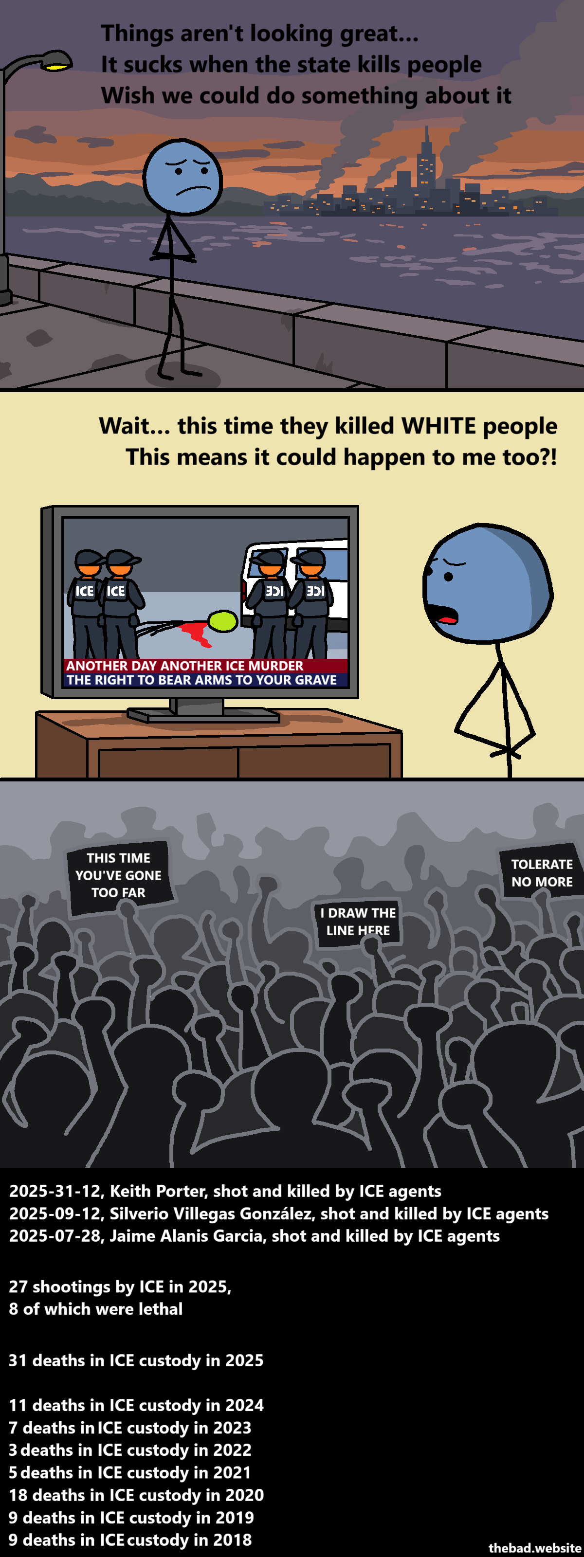 In any case, after double-checking, two of the non-white people you directly point out as shot and killed by ICE were undocumented. I’m not actually sure one was even shot since skimming a few sources indicates he fell off a roof and died from that during a raid. Obviously being undocumented doesn’t justify getting killed, but that’s another difference (citizen vs. undocumented noncitizen) between Good and Pretti that you’ve chosen to ignore in favor of solely basing your comic on them being white or not.