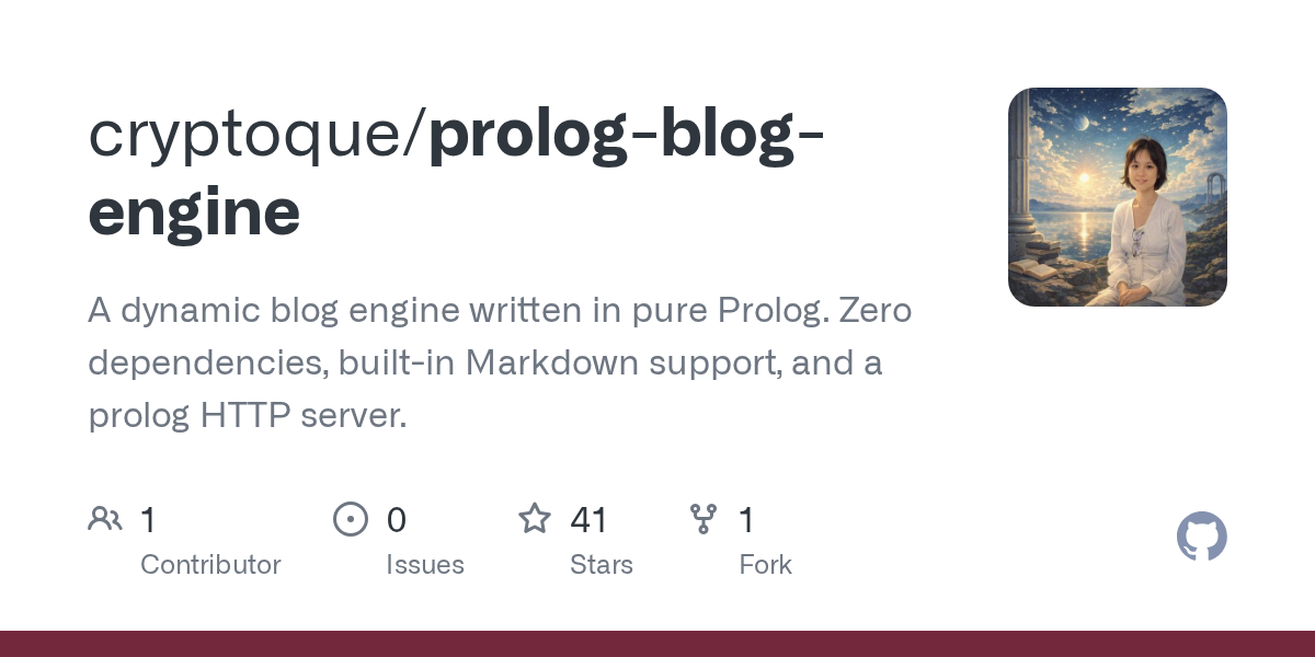 arrow-up12arrow-down1external-linkprolog-blog-engine: blog engine in pure Prolog. 0 dependencies, Markdown, servergithub.comRSS BotMB to Lobste.rsEnglish · 30 days agomessage-square0linkfedilinkfile-text