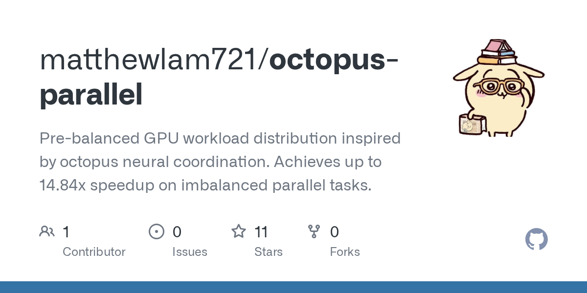 arrow-up12arrow-down1external-linkI got 14.84x GPU speedup by studying how octopus arms coordinategithub.comRSS BotMB to Hacker NewsEnglish · 1 month agomessage-square0linkfedilinkfile-text