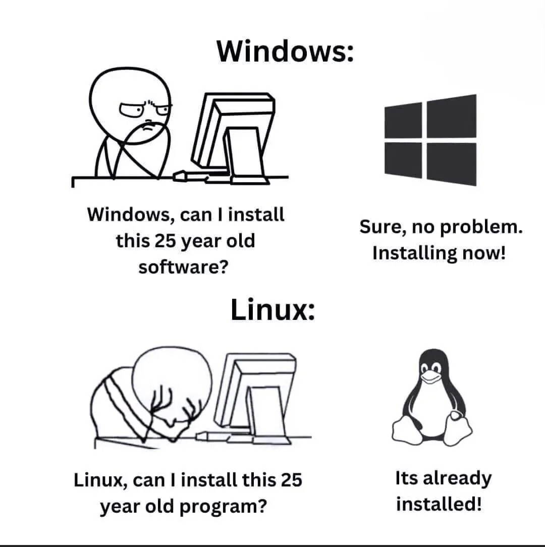 Windows sucks, but I made some tools 20 yrs ago and they still just run in win11. As they did on all other windows before since…I dunno, 95? Or 3.11?