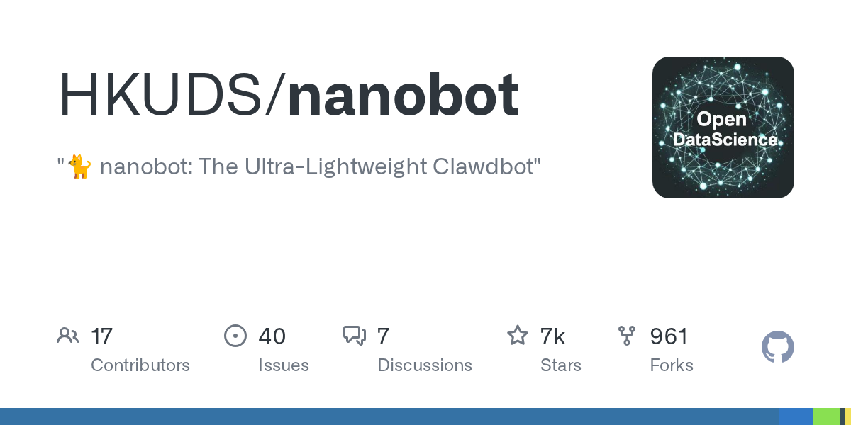 arrow-up17arrow-down1external-linkNanobot: Ultra-Lightweight Alternative to OpenClawgithub.comRSS BotMB to Hacker NewsEnglish · 2 months agomessage-square0linkfedilinkfile-text