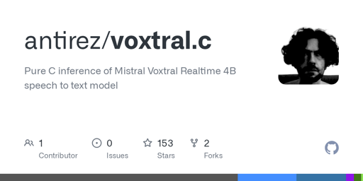 arrow-up12arrow-down1external-linkvoxtral.c: Pure C inference of Mistral Voxtral Realtime 4B speech to text modelgithub.comRSS BotMB to Lobste.rsEnglish · 7 days agomessage-square0linkfedilinkfile-text