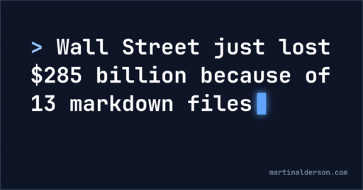 arrow-up18arrow-down1external-linkWall Street just lost $285B because of 13 Markdown filesmartinalderson.comRSS BotMB to Hacker NewsEnglish · 9 days agomessage-square2linkfedilinkfile-text