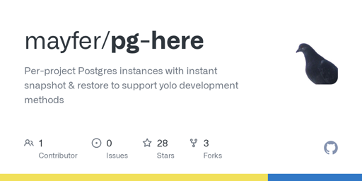 RSS BotMB to Lobste.rsEnglish · 1 month agopg-here: Run a local PostgreSQL instance in your project folder with one commandgithub.comexternal-linkmessage-square1linkfedilinkarrow-up11arrow-down10file-text
