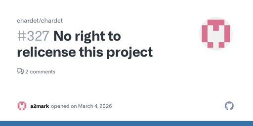 arrow-up12arrow-down1external-linkNo right to relicense this projectgithub.comRSS BotMB to Hacker NewsEnglish · 1 month agomessage-square0linkfedilinkfile-textcross-posted to: opensource@programming.dev
