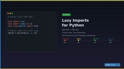 arrow-up15arrow-down1external-linkPython's Lazy Imports: Why It Took Three Years and Two Attemptstechlife.blogRSS BotMB to Hacker NewsEnglish · 7 days agomessage-square0linkfedilinkfile-text