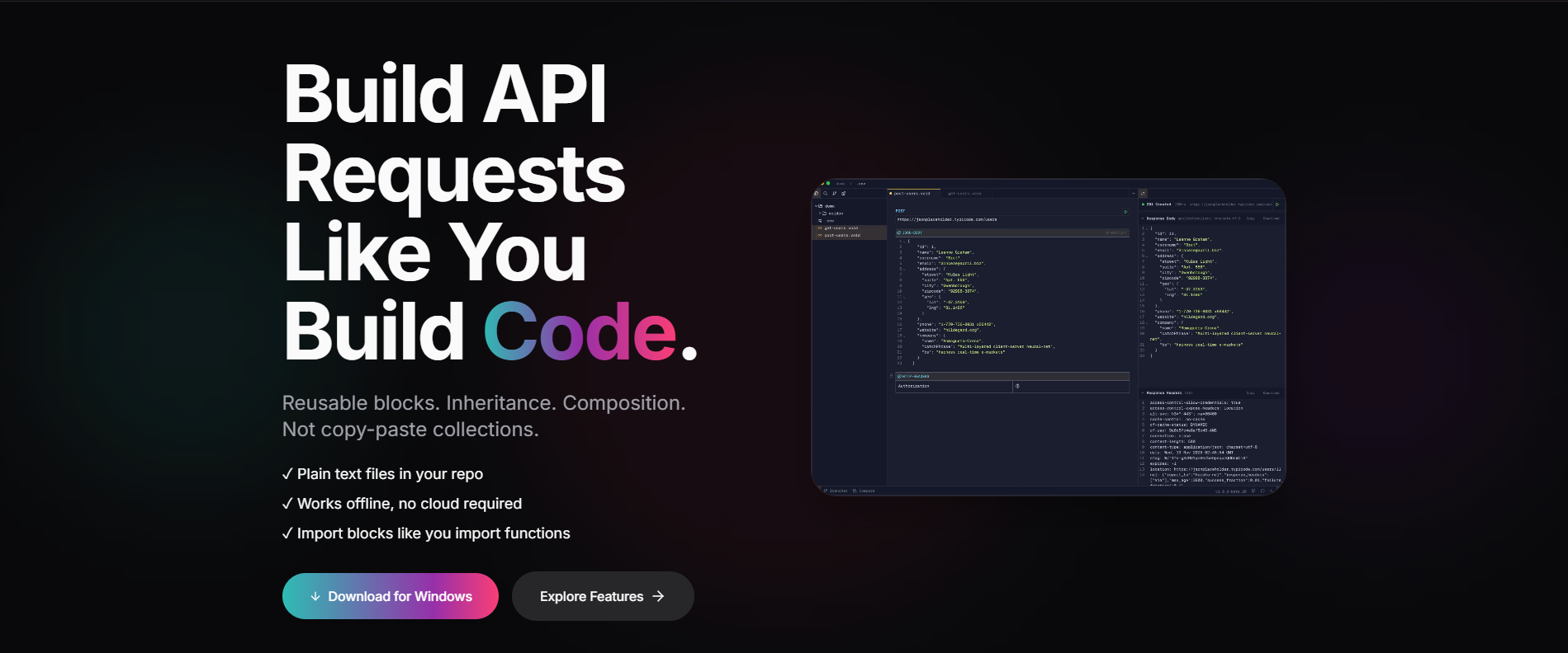 The difference is that Voiden is a dedicated, cross-platform app for the modern ecosystem, bringing the power of that file-centric workflow to everyone. We specifically go further by offering resuable composable blocks for requests (closer to functions than monolithic objects), a unified toolchain for design, testing, and documentation, and a clean, Git-native experience for all developers.